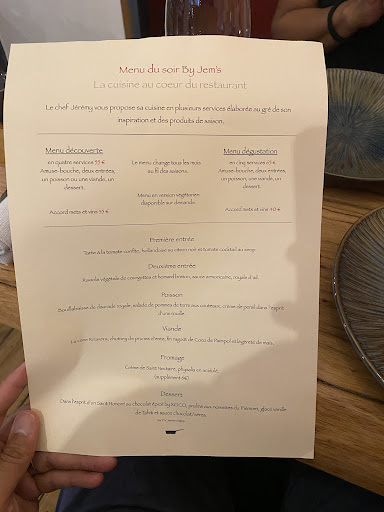 We had the “discovery menu” of four courses, which contains an amuse bouche, two appetizers, a main course of either fish (tuna and octopus) or meat (pigeon with a cherry sauce), and dessert. For €49 this is a bargain given the quality of food, the interesting flavors, the beauty of the presentation, and the excellent service. We also had the wine pairing. Three very interesting wines were served (two white and one red) as well as a very nice 10yo port to finish things off. At €30 we felt this was good value. Michael (Miquel?) who explained each dish was wonderful, as was the chef Jérémy, who came out to greet us at the end, and who showed great curiosity in what we liked or did not like. Well, we liked it all—especially the second appetizer, which featured sashimi over Japanese-style rice wrapped in paper thin dentelles of celery—all with a delightful vibrancy of vinagrette flavor.