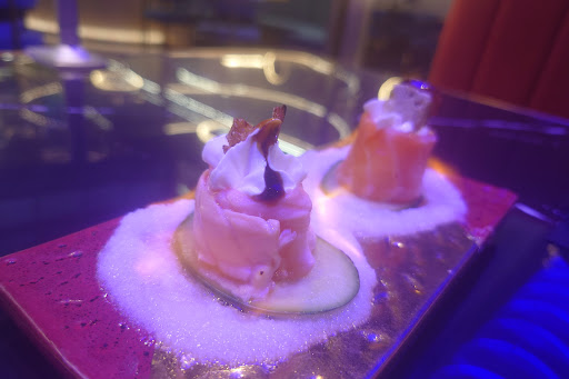 Sinon, le soir plus de plats avec des présentations plus classes encore que le midi, clin d'œil au petit nuage d'azote sur les assiettes de sashimi (classe), et un dressage global très raffiné.