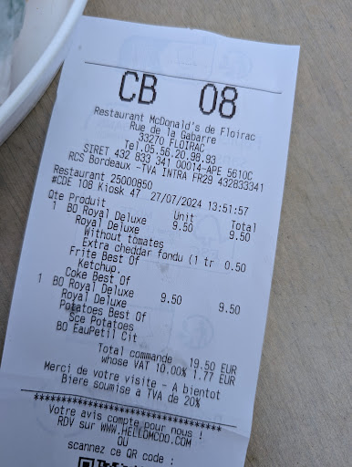 7 min au drive ou personne rentre en contact on reste en plan,puis une voix même pas d'excuse pour l'attente, enfin il y a une voiture avant et moi c'est pas le rush non plus,le mec prend ma commande en plus de celle d'avant j'en étais à 42€ heureusement je lui dit ce n'est pas ma commande il efface tout et obligé de repasser commande.encore perte de temps c'est pas comme si j'avais un.boulot et 1h de pause Arrive le paiement ou il me fait la même il me sort la commande davant il se souvenait plus de ce que j'avais commandé 20 sec avant c'est fabuleux un vrai sketch et biensur pas d'excuse ce serait pas drôle sinon. Puis comme à son habitude oublie d'articles heureusement je vérifie et jinterpelle la serveuse mais j'ai eu l'air de la derange en haussant les epaules et biensur excusez moi c'est trop leur demander. Quand je lis certains commentaires je pense que la direction devrait se poser des questions car pour avoir manger à l'intérieur l'an dernier je me souviens d'une salle mal entretenue, tables sales,j'ai pas été aux sanitaires mais j'ai bien fait je pense . Faut arrêter de répondre un message préconçue vous faites rien pour améliorer moi depuis 2 ans je suis jamais satisfait il y a toujours quelque chose.je voulais voir si ça avait changé dans le bénéfice du doute mais c'est la dernière que...