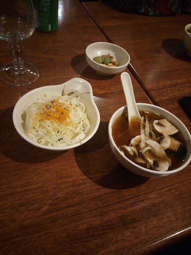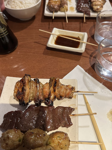 Les brochettes yakitor i étaient immangeables : poulet cru, boeuf trop cuit, une vraie semelle. Le saumon, surgelé, était sec et noir. Seule la marinade dont les brochettes avaient été inondées avait quelque chose qui se rapprochait de 'yakitori'. Nems surgelés de qualité médiocre au mieux , on en trouve de meilleurs au supermarché du coin...