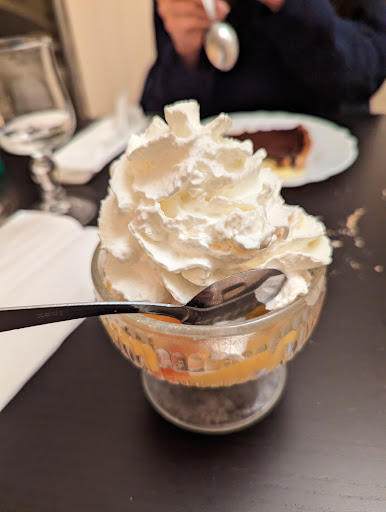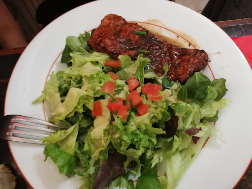 What a find! We couldn't get into the resto a few doors down and we were exhausted. Despite the resto being really busy, they made room for us and we had an excellent lunch with a really rose but the atmosphere for us was what really made this visit special. We had a salad with gesiers that would satisfy the hungriest visitor, home made chunky fries with a good steak and the best blue cheese sauce. The desserts were to die for. The perfect chocolate tart with ice cream and chantilly and creme brulee. Absolutely sublime. Don't miss taking a coffee too as it's so fresh and rich roast.