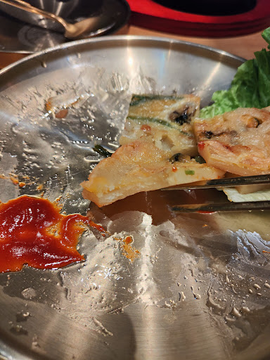Seafood pancake was not cooked well, it was soaking in oil. They gave us Kimchi pancake in the beginning which was not what we ordered, but it was delicious (we both took one before realizing it was not what we ordered). So when the seafood pancake was served, we noticed right away the difference.