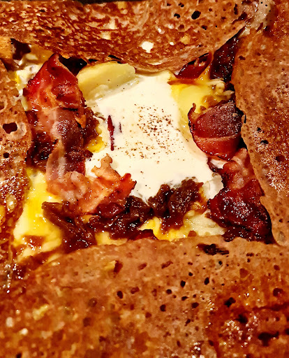 Quand je suis arrivé pour déjeuner, alors qu’il y avait de multiples tables libres, et qui le sont restées, le garçon m’a dit n’avoir de la place pour moi qu’au bar. Je me suis dit: voilà un endroit qui n’aime pas beaucoup les solos. Mais, connaissant d’autres Breizh Café, notamment à Cancale, Saint Malo où Paris, créés par le génial Bertrand Larcher, j’ai persisté. J’ai passé le déjeuner les genoux écartés collés au bar pour gêner le moins possible, et pourtant mon tabouret était heurté à chaque passage des serveuses derrière moi. Malgré un temps d’attente assez conséquent, ma crêpe « du jour » m’a été servie tiède. Je l’ai mangée, ainsi que mon dessert. Quand j’ai payé, j’ai mentionné les heurts désagréables au garçon qui m’avait placé, et il a dit: je sais, que voulez-vous, nous n’avons pas beaucoup de place. Tant pis pour moi, en quelque sorte. Conclusion: il ne suffit pas d’avoir les recettes de meilleures crêpes de France (de l’univers?), et une réputation flatteuse de lieu premium. Encore faut-il exécuter correctement et se soucier de donner au client une expérience elle aussi premium, pour une addition qui l’est aussi. Clairement...