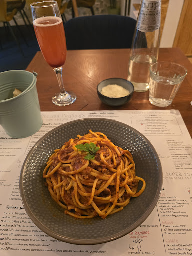 The front entrance has this cute teal colored front entrance that got me while walking by. I peered inside and saw how cute and neat it was inside. The decor was fashionable modern with a contemporary vibe and not old like many other Italian places. I googled it and saw there were great reviews! So I say inside and ordered a couple drinks, the linguine bolognase, and a tiramisu. The pasta was great! It was perfectly seasoned and was NOT bland (which I've been finding a lot of places in Paris with mediocre Italian food) and the pasta itself was cooked to perfection! It was great!! I'm definitely going to come back and try more items on their menu as well. This would be a good place to have a large party since they have plenty of space and large seating available as well! It feels cozy, unpretentious, and the servers were patient and kind despite me butchering the beautiful...