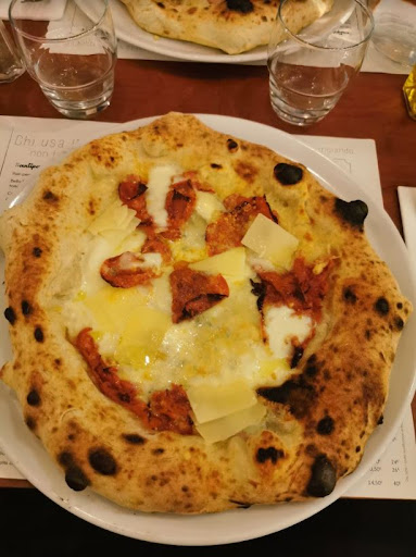 Nous avons seulement pris une pizza chacun et un dessert. En pizza nous avons pris la Mortadella (17€) et la 4 fromages (15€). Ce sont les prix, parisiens certes, mais les prix. J'ai demandé un supplément de saucisson italien sur la 4 fromages, et il me semble avoir demandé combien le supplément coutait, mais je n'ai pas eu de réponse, tant est si bien qu'on s'est demandés si la serveuse n'avait pas entendu ou que peut être je n'avais pas demandé... voir le supplément en fin de repas à 5€ a forcément été une petite surprise, même si il faut reconnaitre que la portion du supplément était correcte.