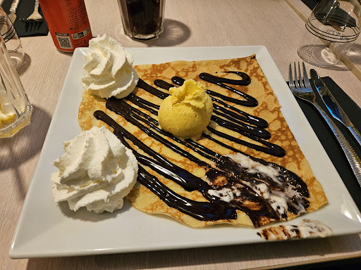 Cuisine: La cuisson de la crèpe est maîtrisé de bonne taille, la chantilly légère, boule de glace de qualité et chocolat noir maison pas trop fort