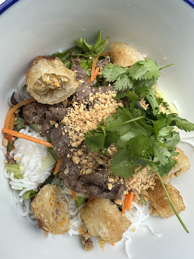 Read moreLe repas avait pourtant bien commencé : les entrées que nous avons pris étaient bonnes : rouleau de printemps et raviolis frits très bons. Pour les plats, ça se complique : le phò était bien servi mais fade, le bo bun très bon mais le curry coco n'est pas terrible (sauce trop liquide, goût de bouillon en cube très présent...). Les desserts : abstenez vous. Le chè (riz noir gluant au lait de coco et mangue fraîche) était une boule de riz gluant noyée dans une soupe de lait sucré, le fondant au chocolat (qui est au prix de 6,50e) est un vague gâteau minuscule suant le gras et réchauffé au micro-onde... Et le personnel a l'air dépassé par l'affluence. Donc en somme, restau assez décevant malgré quelques...