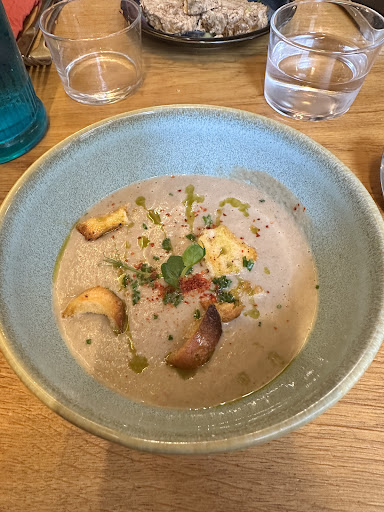 Read moreMouais, bof, de l'assemblage. On m'avait conseillé l'endroit pour les tartares mais nous avons pris une pièce de boeuf avec purée qui était un des rares plats disponibles. Comme on peut le voir sur les photos, c'est une purée collante (mixée ?) avec de la viande cuite à côté ou dessus et quelques condiments dessus. Viande dure pour moi et correcte pour mon fils. Soit. Sauce au poivre type Métro. C'est de la nourriture mais est-ce de la cuisine ? Non. Pour faire passer le fait que ma viande soit (très) dure bien que correctement cuite, on nous offre une entrée : pâté (corse et bon) acheté au marché à 20m, et : des cornichons dessus et quelques herbes encore. Le marketing concept pitch model doit être "pas de stress, ça passera". L'ambiance est assez sympa mais le prix élevé et injustifié. Rien de basque hormis les verres à fond...