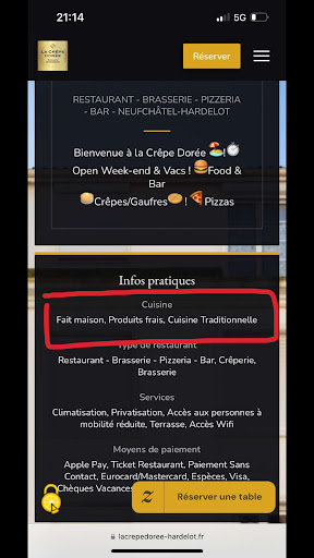 Read moreCatastrophique. Habituée des lieux depuis des années avec le changement de propriétaire récemment la "nouvelle crêpe dorée " n'a plus rien à voir. Personnel désagréable, l'état de propreté des tables et des cartes qui sont grasses et collantes. Les plats avec des ingrédients bas de gamme sans aucune saveur... la salade verte grasse et mal nettoyée. Lorsqu'on me débarrasse les assiettes repartent pleine donc forcément c'est que ça ne nous a pas plu. La serveuse fait tomber à 2 reprises les couverts sales sur moi, on voyait qu'elle était en stress et non formée. Je le signale à la serveuse que ma salade n'était pas du tout bonne et qu'il y avait une chenille dedans, je lui montre. J'ai tout laissé dans l'assiette.