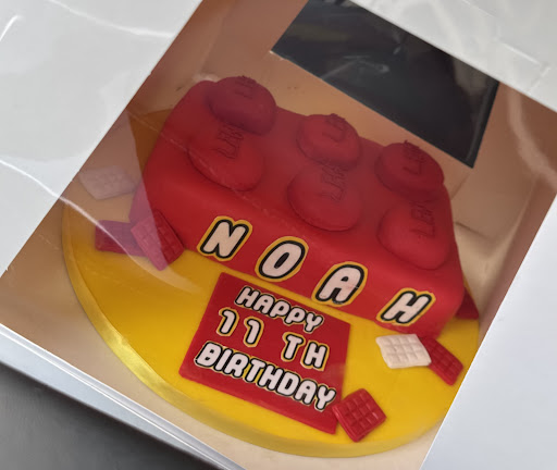 À la réception, le gâteau ressemblait vaguement au modèle mais de nombreux détails n’étaient pas respectés : pas de personnages, pas de petites briques Lego (remplacées par des tablettes de chocolat), des bords arrondis au lieu d’angles carrés, des finissions très limite sur le pâté à sucre à l’arrière et des boules au-dessus qui n’avaient rien à voir avec le modèle….
