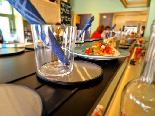 Read moreVoulant fuir le restaurant de l'aquarium de Boulogne sur mer qui , apparemment, n'est pas fameux, nous nous sommes réfugié dans ce petit restaurant juste en face. Ambiance agréable de prime abord et très bon accueil de la part de la serveuse, cette dernière nous explique le concept du restaurant. Elle nous pose quelques questions sur nos goûts , allergies alimentaires éventuelles ou intolérances et c'est parti. C'est donc une pizzeria avec comme principale attraction le buffet à volonté. Mais petite particularité, le buffet est roulant à la manière des échoppes japonaises. Ici point de sushis mais des verrines pour les entrées, des petites assiettes avec des parts de pizza pour le plat de résistance et des desserts. Les entrées sont goûteuses: taboulé au pesto et poulet rôti, verrine de salade de pâtes et saumon fumé. Les pizze sont EXCELLENTES ! On devine que le pizzaiolo maîtrise son sujet. Une pizza à la mode napolitaine dont la corniche est bien alvéolée ( probablement levée la veille ), des ingrédients de qualité et surtout disposés généreusement. Le nord ne nous déçoit jamais sur ce point. Sachez qu'il est aussi possible de prendre des pizza à emporter, comme une pizzeria classique. J'aurais peut-être aimé une petite salade verte sur le tapis roulant. Mais je suis certain que j'aurais pu en demander une sans soucis. Les desserts étaient aussi très bons avec une délicieuse salade de fruits frais, et deux gâteaux de qualité fort goûteux.