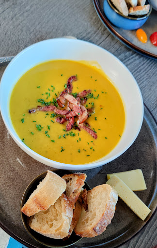 Absolute must visit! There aren't many places that open up for you these days when you knock hungry at their closed doors! Not only that but the owner cooked us extra a delicious maniok coconut soup with grilled bacon and some cheese and grilled bread aside (see pic). So we happy pilots could hit the road... Errrr air again and head home safe and sound. BTW the restaurant is super clean and nicely decorated with really nice place settings, simply a fantastic experience, thank you so much and...