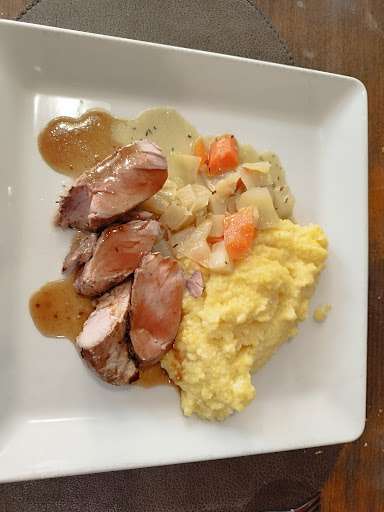 Pour le plat principal, j'ai choisi le Filet de sandre poêlé, crème au thym-citron et safran, légumes d’été. C'était tout simplement excellent, avec un dressage soigné. J'ai aussi goûté au Jarret de veau cuit fondant comme un « osso bucco », jus à la milanaise. Je n'en avais jamais mangé auparavant, mais maintenant, je sais où en trouver un bon : à La Coq'Hôte. De plus, je n'ai vu aucune sauce dépasser des assiettes ou des bols, tout était propre et soigné.