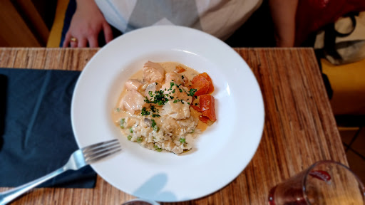SituĂ© en centre-ville, dans une rue semi-piĂ©tonne, lâĂ©tablissement offre une salle rĂ©partie en âUâ et une terrasse partiellement couverte. Lâaccueil y est agrĂ©able, presque convivial mais nâen reste pas moins professionnel. Le lieu semble rĂ©putĂ© car, en Ă peine dix minutes, sur les coups de midi, la salle est comble. Seul bĂ©mol, elle devient aussi trĂšs bruyante. Au menu : âą 2 porto rouge âą 2 menus en formule âplat-dessertâ Ă 13,50 euros o 1 poulet marinĂ© accompagnĂ© dâun ris blanc et de lĂ©gumes poĂȘlĂ©s o 1 marmite de colin et saumon, sauce aux crustacĂ©s accompagnĂ©e dâun rizotto et de lĂ©gumes poĂȘlĂ©s. o 1 tiramisu o 1 crumble pommes-ananas o 1 verre de rosĂ© o 1 cafĂ©. Les plats sont sans fausse note, tout comme les desserts. A lâaddition ; 44,50 euros Bon rapport...