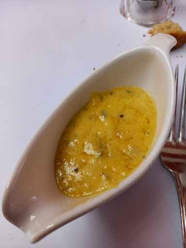 Menu Grand Gourmand complet. Entrée fraîche et agréable, Ceviche de daurade, suivie de grenouilles divines, charnues dans un jus délicieux...nous enchaînons sur une volaille de Bresse (originaire de Bresse, je connais et reconnais mes classiques) succulente, cuisson parfaite, à prendre absolument avec ses morilles, sauce délicate...mais diable pourquoi accompagner cela d'un riz certes blanc, mais bien trop plat? Le maître d'hôtel nous indique que c'est le choix du Maître, et que cette remarque lui a été rapportée...il faut infléchir ce choix, Maître. Votre catalogue de spécialités locales dispose d'autre chose pour accompagner votre si succulente volaille, c'est aujourd'hui une ((première) petite) déception. Ce repas fût accompagnée d'un exquis Viré-Clessé de chez Raphaël Sallet, parmi un joli choix de vins. Un petit commentaire sur le vigneron et ses méthodes de vinification eût été apprécié compte tenu du terroir mais cela n'a pas entaché notre dégustation. Puis vinrent les desserts, un nougat glacé au Maracuja et une Tatin avec sa crème (de Bresse) et son (très petit) lit de gaudes (Bresse toujours), alors comment dire...un nougat si glacé qu'il m'en a été difficile de distinguer une production locale d'un produit standardisé, et une Tatin sans âme ni température...je ne doute pourtant pas que tout cela fût préparé sur place, mais...cela ne s'est pas vu, ni ressenti, ni apprécié. Déception en fin de repas, dommage.