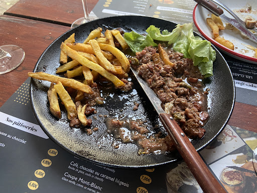 Inviting informal ambience. The service was speedy to start and the food arrived quickly. The first half of my steak was tasty (the rest being fatty) and the fries and red wine sauce were great! The waitress was super with getting order details out of foreigners - great job on that. The rest was not so good. As there was only one waitress, getting her attention so I could have a glass of wine with my steak proved challenging. When the wine did arrive, it was freezing cold. After holding it in my hands for 10 min, it was still considerably cold to the touch. When asked if their reds were always served at this temp (I honestly thought they must have given me a chilled glass by accident), the waitress just said, "Yes, sorry." Odd for a wine centre of France. The side salad served with the steak is three pieces of lettuce, which definitely could just be a French thing. Bring a book if you're dining alone, as the manager does not allow patrons to use the house wifi. Finally, I ordered a bottle of Pellegrino, and despite dining alone, the waitress took advantage of the language barrier and brought me a 1 Litre bottle. I noticed as I looked around that there were couples sharing 500ml bottles, which obviously would have been more appropriate. Looking forward to checking out the other local restaurants during my extended stay...
