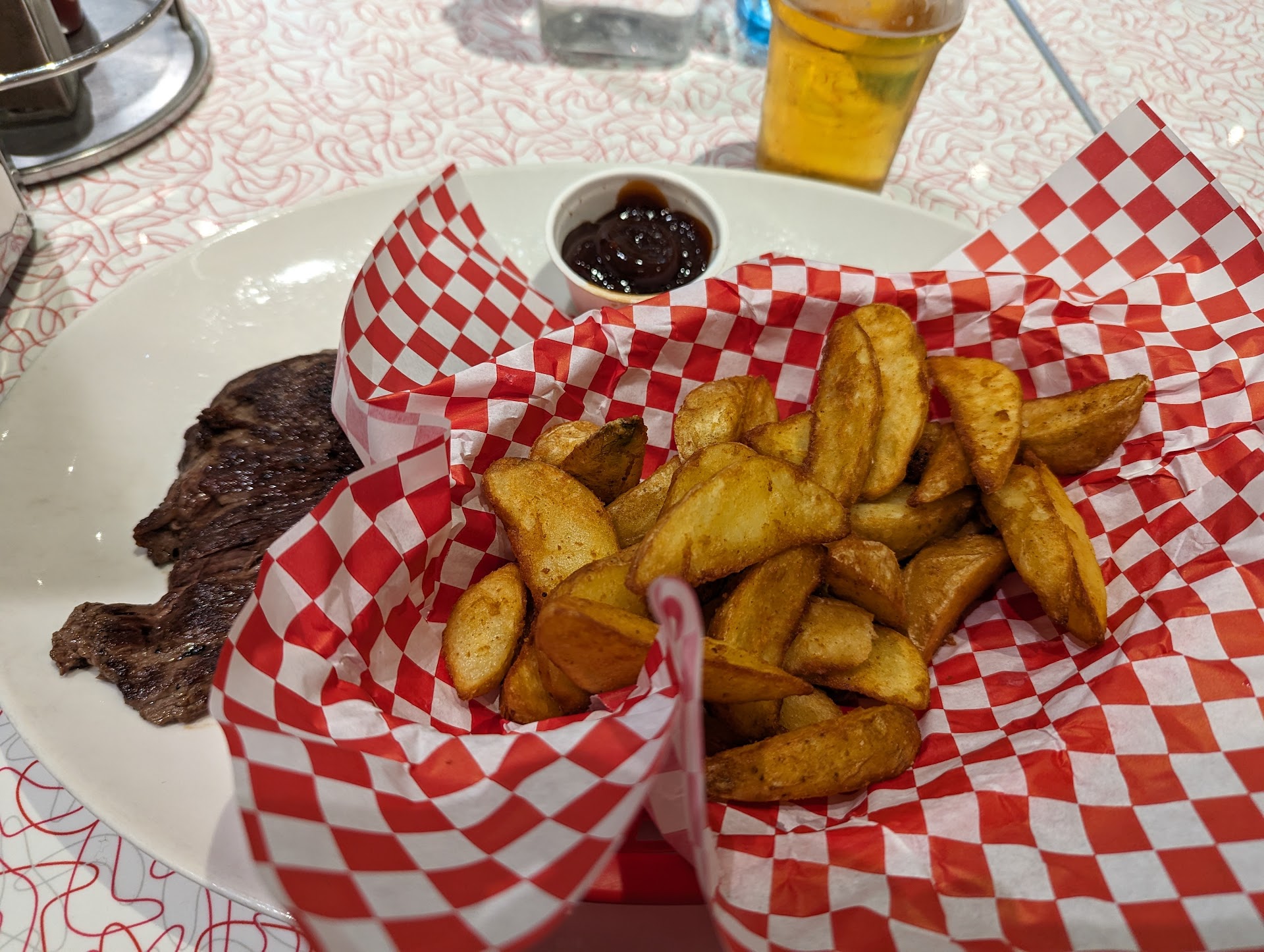 It seemed chaos in the restaurant, low on staff and the communications between staff looked like a family with issues which resulted in bad hospitality. The manager wasn't dressed such or as employee (the rest did, and looked great). Finally after a staring contest we were helped. Food didn't take to long to arrive and was great. Only the beans where cooked wayyyyy to long. The Pepsi float with icecream and flavours is highly recommended!! Interior looked great, but tables who where finished and gone weren't cleaned.