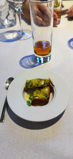Nous avons commencé en prenant un apéritif. Des amuse-bouche nous ont été offerts. Il s'agit d'un cake à l'ail des ours et à la feta, plutôt goûtu et légers!