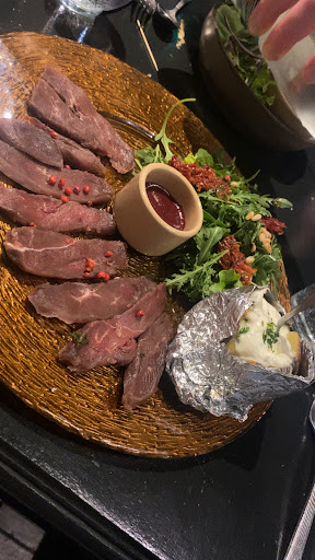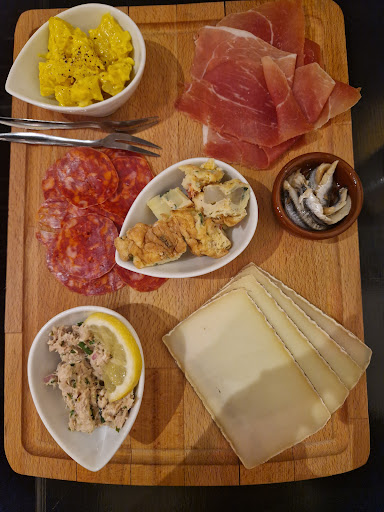 Read moreLieu agréable, assez calme, avec lumière tamisée et musique d'ambiance. Menu possible que le midi, pas le soir. Carte diversifiée : tapas, poisson, viande blanche, viande rouge. Cependant choix des accompagnements limité, il y a soit des frites, soit du riz. J'ai été déçu de ne pas avoir un peu de légumes. Sauce un peu grasse. Belle présentation des plats et serveur très sympathique. Sur les photos : tapas jambon, plats de thon + frites, brochettes de porc + frites, tarte tatin, et...
