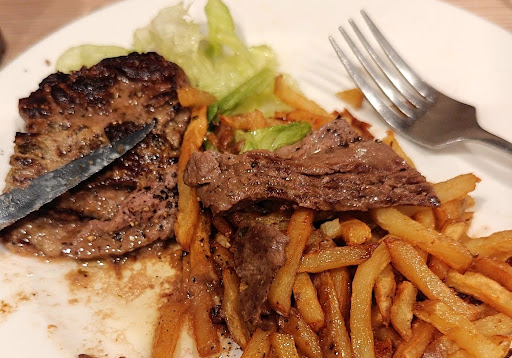 Cela partait bien, une table réservée pour 6 personnes, accueil sympa, déco sympa aussi. La carte est restreinte, mais je préfère ça qu'un resto qui propose une multitude de plats surgelés. Le concept est copié sur l'Entrecôte, même si ce n'est pas de l'entrecôte mais une pièce de bœuf locale, mais sinon tout est pareil : bougies chauffe plat, viande découpée en lanières, sauce au beurre, frites et salade à volonté... C'est bon, rien à dire de ce côté là, mais là où ça commence à se gâter, c'est lorsqu'on se rend compte que les serveurs on oublié de nous demander ce que l'on voulait boire, ainsi que le pain. Ensuite, ça se gâte vraiment lorsque le serveur nous demande (alors que la moitié de la table est dehors en train de fumer) si on a choisi les desserts. Et bien non, puisque nous venons juste de finir le plat ! On sent bien qu'on est trop lent ! Deuxième salve 5 minutes plus tard : "vous avez choisi les desserts ? Parce que j'ai une table qui attend". Ou comment gâcher la fin du repas de 6 amis qui ne se sont pas vus depuis longtemps et qui comptaient passer un bon moment ensemble, sans se faire mettre dehors. Pour le café, on nous a clairement fait comprendre que ça n'arrangeait pas si on en prenait un... Quand on fait plusieurs services, on n'attribue pas forcément 2h chrono à chaque table... Il y a des gens qui vont au resto pour profiter du moment, pas juste pour manger. Et pour finir, pour le règlement que nous avons partagé en 3, cela gênait aussi puisque le temps que chaque couple paye, cela bloquait la caisse (dixit la personne derrière le comptoir). Bref, ça ne donne pas du tout envie d'y retourner. Je m'attarde volontairement plus sur le côté négatif que sur le repas qui était bon car j'ai été très gênée de sentir que dérangeais. J'aurais eu plus de cran, j'aurais repris un café, et un digestif histoire de vraiment déranger ! Sauf que je suis restée correcte, contrairement...