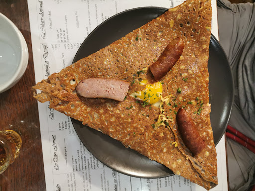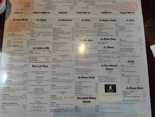 This is one of the best crêperies in Le Conquet (there are four). The service is quick and the staff are very friendly. It's a good place to come as a family or with small kids because they have the space for it, and they even have a basket with books and a few toys. The crêpes themselves are very good and authentic, although the fillings are a bit more traditional than Louise de Bretagne across the street. The ambiance is typical Breton, with granite walls and maritime decor. The kids also love the pirate statue in front. My daughter calls this restaurant "The...