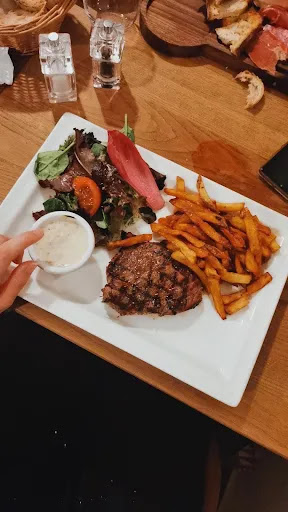 Read moreDeux diners un en intérieur et l'autre en terrasse réussis. Le cadre est sympathique et la cuisine très bonne. Foie gras maison en entrée et entrecôte 350 g ensuite servie avec des frites et de la salade. Plus de place pour le dessert. Trop bon pour les amateurs de viande rouge. Cuite comme demandée. Second diner : petite salade césar en entrée (que l'on peut déguster en plat principal également) et bruschetta. Alors là le top : baguette grillée à l'ail et au beurre recouverte d'un confit d'oignons maison. Le tout est alimenté par des pommes de terre poêlées et des copeaux de foie gras. Dans oublier "le toit" si je puis dire composé de tranches de jambon Serrano. Une salade accompagne le tout. Une tuerie ! Il faut avoir vraiment faim pour prendre une entrée car cest copieux et très bon. Je recommande vivement ce restaurant où le patron et le personnel sont très sympas. En plus un grand parking existe devant l'établissement. Bref tout pour passer une...