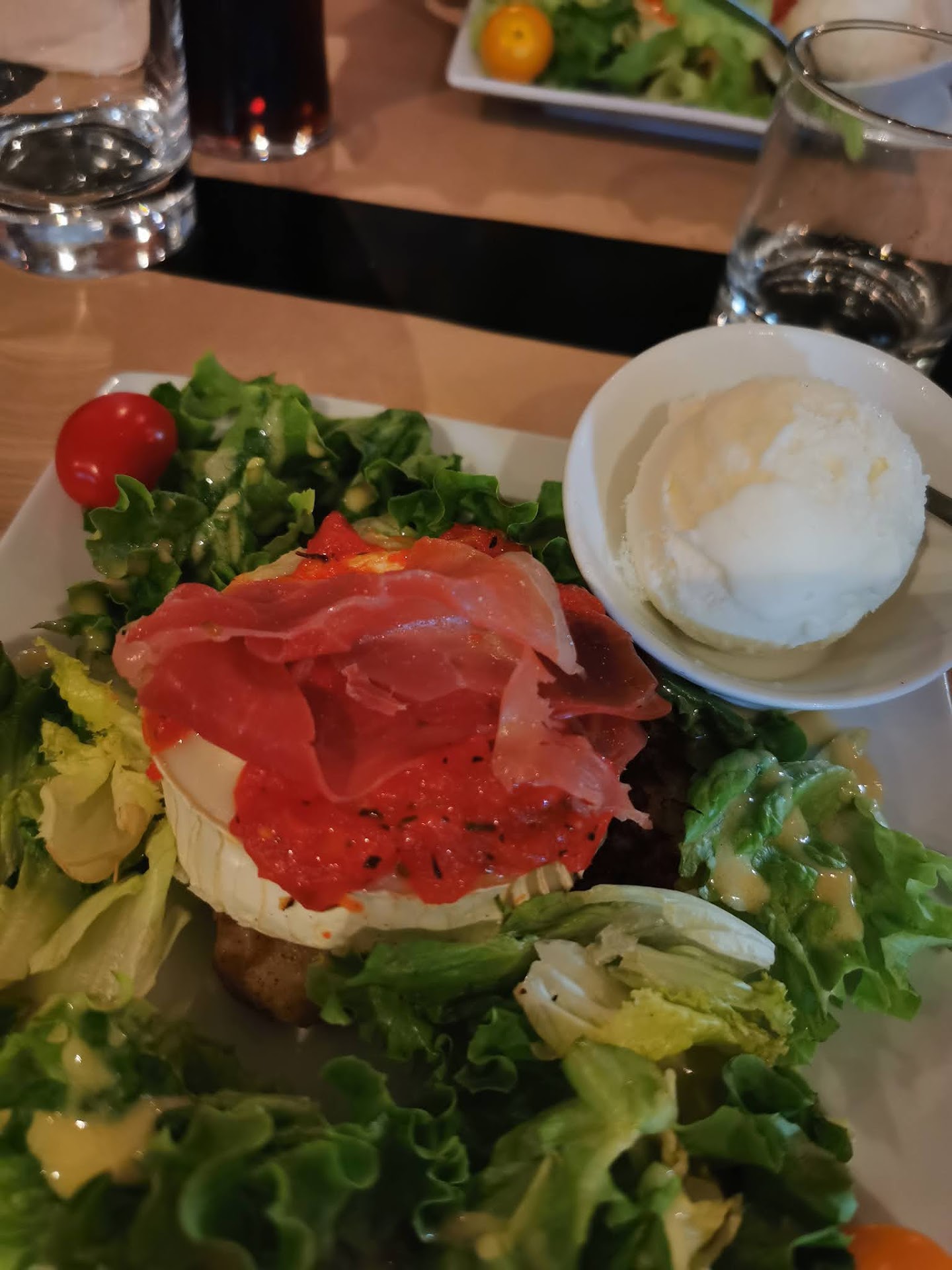 Lors de notre dernier passage, nous avons d'abord partagé un kouign patatez, des galettes de pomme de terre avec des accompagnements différents suivant votre choix, chevre jambon cru et tomates de mémoire pour nous. Nous avons partagé 3 galettes à 3, et c'était largement assez.