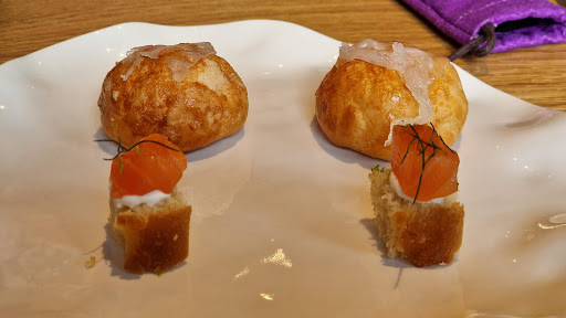 Nous ont été servis 3 amuse-bouches différents : Une gougère au lard et beaufort qui était à la fois fondante et craquante, avec un lard cuit à la perfection. Un petit toast de saumon sur une mayonnaise revisitée également très bon Une émulsion de jus de pomme local sur un jus de betterave parfaitement relevé, il n'en est pas resté une goutte.