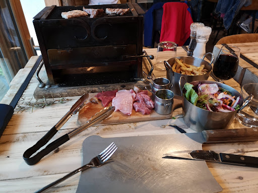 Intérieur chaleureux (qui n'a rien à voir avec l'extérieur du bâtiment plus moderne, entrée et vous serez charmé 😉) Nous avons mangé fin août 2025, et l'établissement été plein, réservation vivement conseillé. Accueil très sympathique, ambiances chalet Alpin et bien sur repas parfait tant en quantité qu'en qualité 🤤 Les trois viandes a griller et leurs sauces parfaite ( tendre et gouteuse) et la cuisson sur son grille placé à table super (voir photo). L'autre plat essayé, l'agneau de 7h.... une tuerie... tendre, fondant, un parfum exceptionnel, et que dire de sa purée au ortie l'accompagnant... parfait! Félicitation pour l'accueil et à la Chef pour tout ces produits locaux superbement mis en valeur... J'en ai encore l'eau à la bouche rien que d'en parler 🤤 Merci pour ce super moment (Le menu enfant très sympa servit sur...