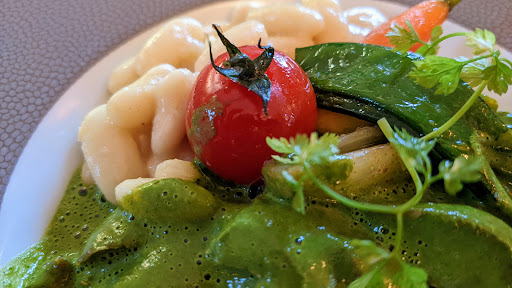 La carte des vins est très étendue et ravira les amateurs de très bons crus. Pour commencer, pour moi un pressé de lapins et pour l'autre menu un cake aux légumes. L'un comme l'autre nous nous sommes régalés. C'est fin, frais et ravissant. Puis ma convive s'est extasiée devant un risotto de blé rond aux asperges. J'ai dégusté un mignon de porc à l'ail des ours et aux haricots blancs. C'était tres beau, très bon, top. Puis une assiette de fromages et pour finir, une farandole de sorbets maison délicieux. Restaurant dont on se souvient avec douceur tant se mot caractérise la cuisine, le service...
