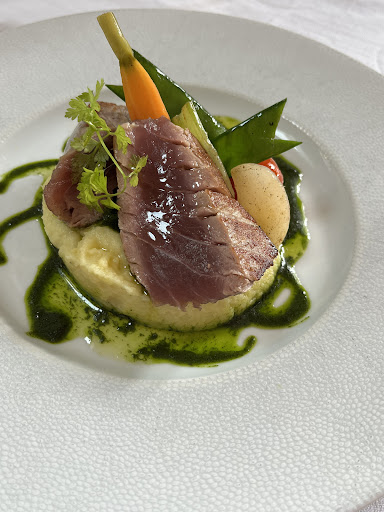 Nous sommes venus un mercredi soir avec des amis. Concernant le restaurant, vous montez quelques marches et vous arrivez sur une terrasse aux airs du sud, une décoration jolie, les oiseaux chantent mais j'avais la vue sur les deux clims extérieures, un peu dommage. Pour ce qui est du service, je parlerai peut être d'un manque de délicatesse voir de maladresse venant de l'une des serveuses, un peu trop froide et brusque et le port du masque nous laisse difficilement deviner un sourire mais évidemment nous ne pouvons pas les blâmer pour cela. La nourriture, une déception concernant le pain surgelé qui accompagne de la cuisine dite raffinée ... (difficile a comprendre au vu du prix du repas). Nous avons commandé deux menus végétariens a 29euros et deux menus a 47euros. Concernant le menu végétarien, quel bonheur de voir un menu végétarien a la carte d'un restaurant Français alors merci beaucoup pour cela. Cependant, j'ai eu l'impression que l'aspect visuel de vos plats n'arrivait pas a atteindre nos attentes gustatives. Vos assiettes sont très belles et travaillées, c'est certain mais le résultat m'a paru insuffisant pour ma part... Au vue du prix des menus, on pourrait s'attendre a une recherche dans la qualité et/ou provenance des produits dommage... Pour finir, je souhaite vous remercier car même si les critiques sont la, nous avons passés un très agréable moment entre amis, nous avons été reçus de manière professionnelle et nous sommes partis en remerciant le chef et non pas de manière hypocrite mais parce que nous le pensions sincèrement.