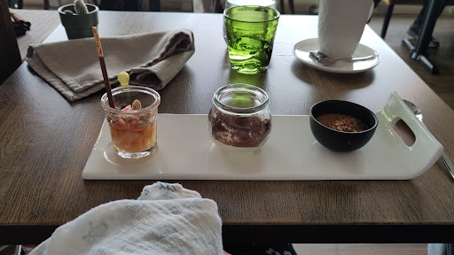 Read moreRestaurant cosy, très joliment décoré, propre, on s'y sent bien. L'accueil est super. Les assiettes délicieuses et copieuses, soignées avec de bons produits, des petits détails qui font la différence, c'est gourmand et fin à la fois, la vaisselle est très bien choisie... Les propriétaires sont très agréables. En fait tout est très cohérent, bien pensé. C'est un très bel endroit et nous y reviendrons car nous nous sommes régalées. La burrata sur son tartare de fraises était excellente et le café gourmand trèèès gourmand, un régal ! Merci beaucoup pour la bougie d'anniversaire pour ma maman et à...
