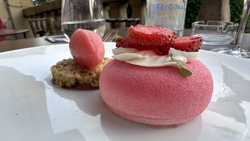 Read moreLe service est bien trop lent.... c'est vraiment problématique. Arrivés entre 12h30 et 12h40, nos commandes sont prises à 13h, les entrées arrivent à 13h45 pour des entrées casi toutes froides. Le plat principal est servi à 14h30, le dessert à plus de 15h passées. C'est incompréhensible un tel délais dans un restaurant gastronomique. L'entrée végétarienne est vraiment ridicule en terme de quantité, il aura fallu un accompagnement consistant. Les viandes sont excellentes, raffinées, mais justement peut etre trop de détails au détriment de la qualité du service. Les desserts sont excellents et comme les entrées, pauvres en quantité. Les toilettes laissent vraiment à désirer : sol et tapis très sale, décoration grossière. Le cadre est magnifique, ce qui permet de passer un bon moment en famille mais pour le reste, on pourrait bien bien...