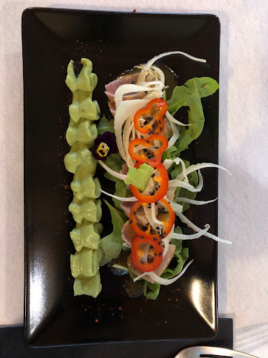 We decided to dine here yesterday and was lucky enough to get a table for dinner on a Friday evening. Rsvp a must as there are not many tables. Modern decor with elegance and very cosy with their table lamps from Imagilights. I took a photo on the menu, it may not be clear. Their menu is available on the restaurant's website. 3-course dinner is 38€ tax inclusive. We ordered à 50cl bottle of white house wine (local vineyards) at 15€. We ordered the sea bream (dorade) ceviche with Ponzu sauce and yuzu pearls. Its a burst of tingling flavours you feel the freshness and sweetness of the seabream with the tangy flavours of yuzu and the pony compliments both. The egg mollet deep fried with panko breadcrumbs in a soup of corn with coconut cream and smoked duck filet (magret fumé), was just heavenly. The different flavours and textures were just divine. The main dishes were risotto with half a lobster and prawns in chorizo and aniseed emulsion was excellent according to my partner. My turbot filet in clear dashi soup accompanied by bak choy, enoki and shitake mushrooms, carrots and beans was delicious. The turbot was fresh and firm. The vegetables were crunchy exactly how I like my vegetables. This dish was heavenly. Desserts were dacquaise in white chocolate with praliné chocolate and sorbet was delicious according to my partner and mine was Delicatesse Fruitée, an entremets de mango and passion fruit on a coconut dacquaise. What can I say but simply delicious and fresh. The bill for 2 set dinners and 1 bottle of 50cl came up to 90€ for 2 was worth it. Loved it, and will...