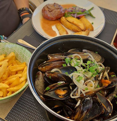 Après nous avoir placé quelqu'un est venu prendre notre commande, le plat est arrivé après 40 minutes d'attente ! Les moules étaient bien et les frites bonnes mais aucune sauce avec les frites. La rosace de magret n'est en réalité qu'une jolie mise en place des morceaux secs et les moins bons d'un magret. La cuisson est mauvaise et non uniforme, la viande est sèche.