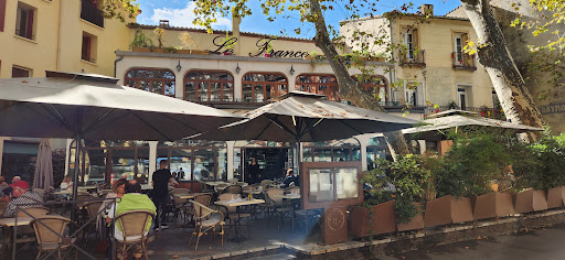 Une impression globale mitigée. Belle terrasse très agréable sous les platanes. Il y en a pour tous les goûts : soleil, ombre ou les deux. Popularité oblige ... les tables sont assez proches les unes des autres. Mix de clientèle d'habitués et touristique. Fréquentation importante le samedi midi avant - pendant - après marché. Carte de brasserie correcte. Prix dans la moyenne de la région. J'avais choisi la formule " Entrée + dessert " à 14,50 € Qualité au rendez-vous pour la salade : Mousse de fromage de chèvre aérée comme un soufflé sur un tartare de tomates : Top ! Mais comme souvent la tomate fraîche dans la salade verte était sans goût. Dommage ! Bon en même temps ... ce n'est pas encore la saison. Heureusement que les oignons émincés apportaient un peu de peps. Bon pain. Bonne note sucrée ++ pour la fin pour le goûteux Tiramisu. La cuvée des artistes, un corbières blanc (à 3,50 €) servi frais tenait plutôt bien la route. Un service (nombreux serveurs/ses) pro. rapide, sans chichis, mais tout juste aimable et attentionné. Les 2 euros laissés en plus d'une addition de 18 euros n'ont pas déclenché l'euphorie. Soit ! Mais un peu plus d'enthousiasme aurait été apprécié. Pour compléter le titre ... Comme si l'accueil souriant et prévenant n'était pas une priorité vu que l'établissement fait...