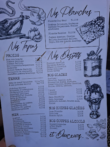 La carte des tapas est un véritable festin pour les sens, offrant une sélection qui reflète le meilleur de la cuisine catalane, avec une touche marine typique de la région.