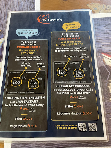 Read moreOUPS!! Commençons par le positif : produits de la mer frais et de qualité ! Très bien cuisiné ! Il faut mettre le prix mais on en ressort ravi. Service de qualité. Voilà ce qui justifie les 3 étoiles maintenant je vais vous parler de mon expérience d'hier qui malheureusement restera négative... J'étais déjà venue à Ty Breizh en juillet 2019 " en pleine saison" et j'en gardais un souvenir tellement positif que c'était un passage incontournable pendant mes vacances à Argelès au mois de septembre. Le concept d'aller choisir ces poissons qui seront cuisiner par un super chef Breton et son équipe et de les retrouver quelques minutes plus tard dans son assiette est génial. Sauf que hier, je n'ai pas retrouvé dans mon assiette ce que j'avais acheté !! L'erreur est humaine disons donc on a simplement fait remarquer au serveur cette différence qui s'est tout de suite excusé et à fait remonter l'information. Quelques minutes plus tard, le serveur nous ramène une assiette avec le "complément" donc erreur rattrapée ( même si nous restons avec le sentiment d'avoir été pris pour des ...) Mais nous continuons notre délicieux repas. La femme du chef de cuisine vient à son tour nous voir pas pour s'excuser non mais pour essayer de justifier ce qu'il s'est passé. Une simple excuse et nous souhaiter une bonne continuation aurait suffit à nous faire passer un agréable moment. Mais lorsqu'on lui exprime notre étonnement sur le fait qu'il y ait eu une différence entre notre séléction et ce qu'on nous a servi voilà qu'elle se vexe. Et à ce moment là la conversation était donc fermée et notre avis de client n'était pas pris en considération. Résultat de cette expérience, T'y Breizh a beau disposer de l'essentiel, un chef de talent, un beau concept et un lieu exceptionnel si ils ne savent pas gérer le plus important : la satisfaction client et bien c'est un lieu où je ne retenterai plus l'expérience et que je ne recommanderais pas. Bonne...