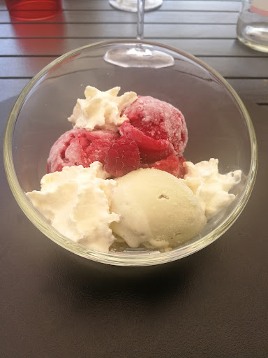 I enjoyed the lamb, which came perfectly cooked with a crispy sear on the outside, and some kind of a light glaze – not quite like duck a l’orange — less sweet and real improvement over an American smear of mint jelly. I also ordered a glass of local Collioure red wine (who knew?) that partnered beautifully with the Lamb.