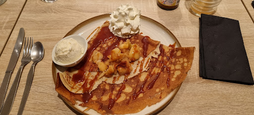 Bonnes galettes. J'ai pris une forestière. Et également, bonnse crêpes ; je mets en photos la "Bocage" (Caramel au beure salé maison, pommes rôties maison, glace vanille, chantilly). Tous les produits sont locaux, frais et cuisinés sur place. C'est une bonne adresse en sortant de l'abbaye aux Hommes, ou à l'issue d'une promenade dans le,Vieux Caen des XVIIème et...