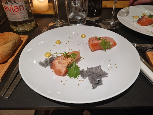 Un saumon gravlax, tiède, à mon avis tout à fait réussi, associée à une forme de chips japonaise et trois pointes d'une mayonnaise épicée au combawa. La chips colore d’un léger sucre la saveur salée intiale. Un suprême de volaille accompagnée de succulents champignons japonais. Cuisson réussie et bon mariage des saveurs. Une sphère citronnée couronne le tout. Le jeune chef, formé auprès de deux M.O.F. joue avec les diverses épices avec équilibre et finesse. Il est dommage qu'un Brouilly, médaillé, de 2019 soit servi à la carafe et non en bouteille de 50 cl. Les serveurs, (recrutés en toute hâte suite à plusieurs départs) débutent, apprennent leur métier et font du mieux qu'ils peuvent ; ils ne s'en sortent pas si mal. Raison de plus être bienveillant et pour ne pas leur passer vertement la soufflante à ce que j'ai pu observer, ce qui plombe un peu l'ambiance d'avant le concert. Je suis tout autant attentif à la qualité du traitement du personnel qu'à l'accueil onctueux de clients en retard...