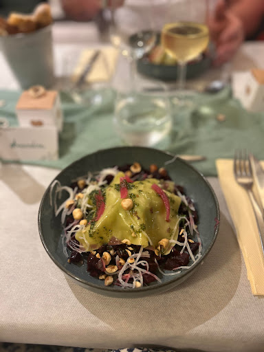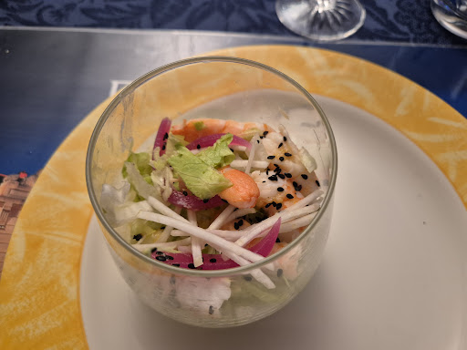 Read moreLe restaurant, qui n'erst pas très connu, se distingue par sa carte, simple, mais régulière, soignée et toute en délicatesse. Pour un repas de Noël, une panna cotta de céleri rave aux crevettes associe de multiples croquants avec des couleurs et de la finesse. Puiis, suit une noix de joue de beauf braisée aux cèpes accopagnée d'un gratin dauphinois. Tout cela se clôt par undôme de chcolat noir croustillant.