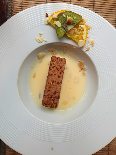 Next up : rice pudding. Watery and overly sweet. A shame as I can see vanilla specks floating in it. The kiwi fruit semi circle was the best feature...