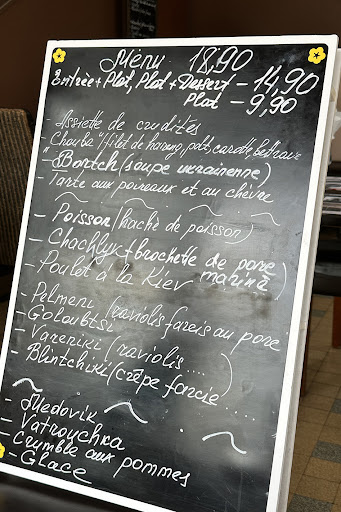 Read moreQuelle merveilleuse découverte que ce restaurant ukrainien qui revisite avec maestria et subtilité de savoureux plats venus tout droit d'Ukraine, de Géorgie et de Russie, concorde culinaire qui met du baume au coeur en ces temps difficiles. 6 entrées et 6 plats à la carte, sans compter quelques desserts particulièrement réussis. Des créations raffinées et parfaitement maîtrisées par la patronne qui oeuvre admirablement au four et au moulin. Difficile de résister au chouba en entrée, au poisson délicatement relevé de marinade citronnée et d'herbes fraîches en plat principal, et aux nombreuses ravioles et crêpes qui recèlent viandes et légumes finement accomodés - mention spéciale pour le caviar d'aubergines - et dont les pâtes sont à tomber !...