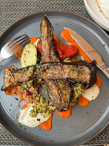 Vegan-adaptable. They have âBuddha Bowlsâ- one veg with a big burrata cheese on top. I asked for it on the side so my dining partner could have it. We also had the vegan roasted eggplant with tahini sauce and red pepper sauce (on the seasonal menu). Photo here shows the partial dish since Iâd already taken one. We also had a wonderful green gazpacho that only had a teaspoon of goat cheese sauce dolloped on top-easy to get it without. What they call âlemonadeâ is actually a bad version of 7-up soda. Other than that, it was delicious. Great patio too....