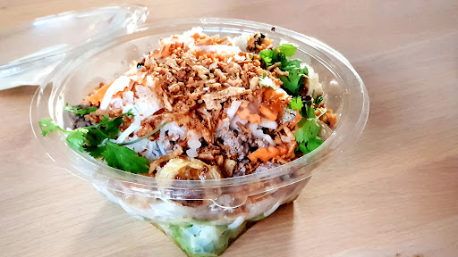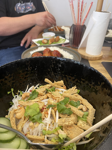 Min seemed passionate about the Vietnamese food he had at this establishment. The food was already made in the front case. Very dirty and many dead plants. It felt like a whole in the wall so to embrace new experiences we stayed. There is a wood log wall that is beautiful decor but bugs coming off and on the booth. The presentation of food was good but the food not good. My vegetarian bobun was mainly bean sprouts, chicken meatballs tasted like a type of meat never tasted before, curry tasted chalky and old, the beef and vegetables had good flavor, the chicken skewer looked like more coating then meat & the rice was old and hard. There is potential if the location was clean and the dishes were made to order than premade...
