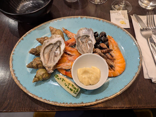 It's the second time we come to Oh Mouettes in the past 2 months and I am now certain that it is a must-visit restaurant in Calais if you come from the UK and want to start your French gastronomic odyssey on a high, or if like us, you just want to add an hedonistic highlight to your daytrip. Of course, you should come for the seafood: Every dish is original, perfectly thought-through and the result always leaves me baffled on how interesting a classic seafood like prawns or scallops can become once it has been through the creative ideas of the chefs. From the subtle and refreshing "mise en bouche" to the succulent "Noix de St Jacques poêlées" and it's ever-moreish mushroom and pepper sauce. But to me, the desserts are taking the biscuit (haha!). I keep ordering the Crumble of sablé Breton with that astonishing caramel cream with salted butter that would make any Brittany top-chef green with envy. I have yet to try the others so I will need to come back, obviously... Oh and the service...