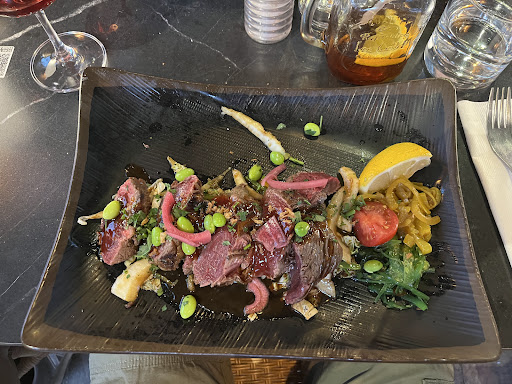 Le repas ? Un vrai régal. Nous avons commencé par une burrata en entrée, parfaitement présentée, bien crémeuse, accompagnée de légumes frais et savoureux. Ensuite, le plat principal : une cuisson demandée saignante, servie presque bleue… Un choix du chef pour surprendre ? Peut-être, mais si c’est le cas, le pari est réussi : la viande était d’une tendreté incroyable. De la côte de bœuf au filet de bœuf façon thaï, tout était parfaitement maîtrisé, avec une attention particulière portée à chaque ingrédient, comme si rien n’avait été laissé au hasard.