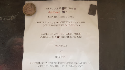 Read moreNous somment passés ma femme est moi par hasard. L’accueil du patron n'a pas été au top, on avaient vraiment l'impression de l’embêter. Franchement le menu a 15 euros n'est pas terrible. Les deux petites tranches jambon de l'entrée ce battent dans l'assiette, les énormes haricots ne sont pas cuits et bien croquants!!! Le dessert un flan quelconque, sans grande saveur. Mais ce n'est pas le pire, quand le patron ma annoncé la note... 45 euros pour deux menus a 15, sur le coup je n'ai pas fait attention et j'ai payé, puis je lui est dit qu'il y avait une erreur, il ne ma redonner que 5 euros, faites le calcul... C'est la que ça ce "Corse", ma femme ne me l'a pas dit sur le coup, mais quand le patron a voulu que je le prenne en photo avec ma compagne, il a eu des geste très déplacés sur elle, des attouchements est des mots bizarre. Elle a été bouleversée pendant plusieurs jours. Un très mauvais souvenir. Évitez ce lieux, surtout si vous êtes en bonne...