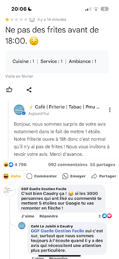 Read moreBar Café acceuille tres sympa, endroit agréable mais celui-ci est beaucoup trop petit .. coté friterie c'est pas mal meme si quelques ameliorations sont a faire ... j'ai etait déçu sur certains points par exemple l'attente est considerable, les serveuses ne doivent pas manger en se servant pendant le service, il met arrivé que les frites d'une présédante commande resté là depuis plusieurs minutes soit repassé une troisiemes fois dans l'huile suite a ma reclamation le probleme a etait vite resolu, mais cela ne ce fait pas, une chance que je l'es vue. coté produits c'est plutot trés correcte sauf le kebab que je trouve beaucoup episé salé, j'ai testé et malheureusement pas terrible désolé.. La note pourra + ou - evolué en fonction des améliorations...
